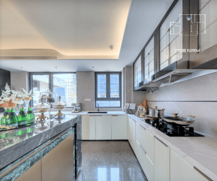 约200㎡户型:五开间朝南设计,IMAX观景阳台,主卧配备270°转角窗,创新"双主卧"配置,满足多代同堂需求。