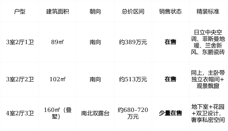 在售户型 :主力在售为 89–102㎡ 三房 ,总价 389–513万元 ,均价约 43,500元/㎡ ,目前为尾盘清栋阶段,房源有限。