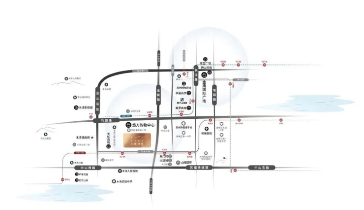(3)教育资源——苏州外国语学校、木渎实验小学/实验中学/高级中学、苏州高新区第一中学、范仲淹附属幼儿园/实验小学、南行实验小学/中学、金山实验小学/高级中学。