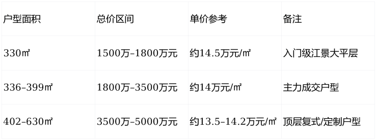 真实价格体系:总价1500万起,均价14万/㎡