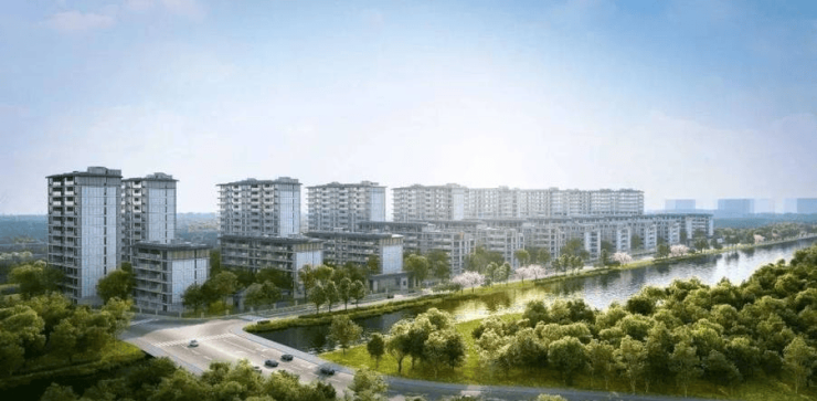双河景资源:板块内唯一低密水景社区,融合苏式灰白立面与现代玻璃幕墙设计