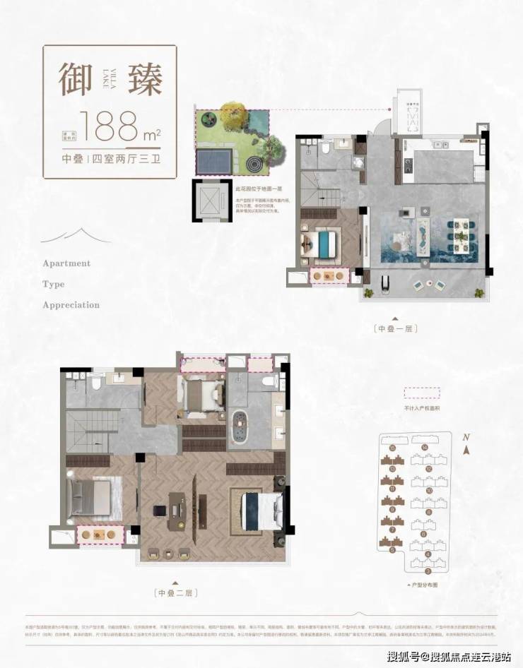 中下叠:约188㎡(四房两厅三卫,下叠赠35㎡南花园,中叠赠15㎡北花园)
