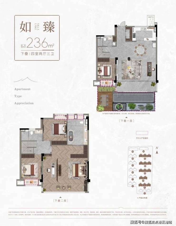中下叠:约236㎡(四房两厅三卫,赠35㎡南花园或15㎡北花园)