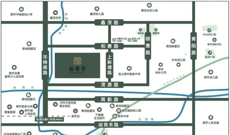 昆山新塘里是由同进置业与昆山北部新城集团有限公司联袂打造的高端改善型社区,位于昆山市周市镇上新塘路6号,地处北部新城核心板块。 项目总占地面积约3.4万㎡,总建筑面积约3.95万㎡,容积率仅1.2,绿化率达35%,是板块内稀缺的低密度住宅产品。