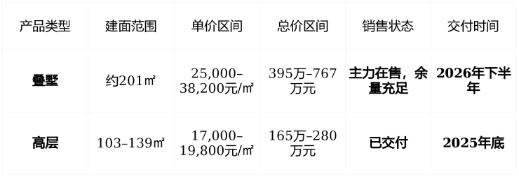 交付节奏 :高层已交付,叠墅正进入集中交付期,2026年为关键交付年。