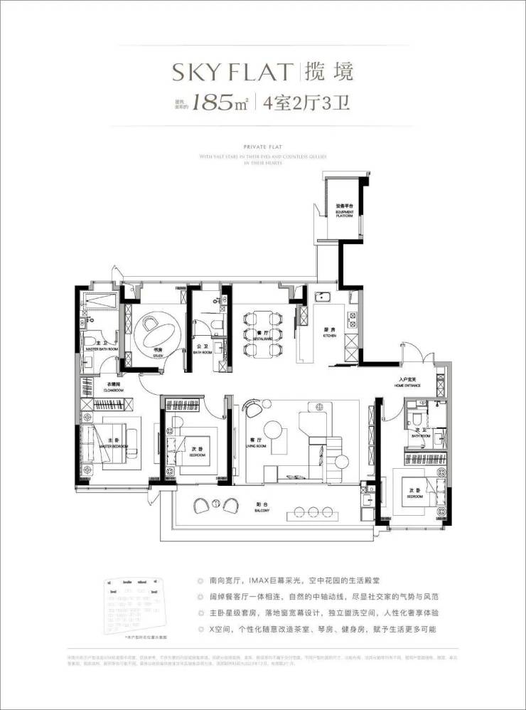 ①空间感优越。在建面约185㎡的空间内,没有单一的追求房间多,以4房2厅3卫的布局,实现功能改善和尺度改善的兼顾。