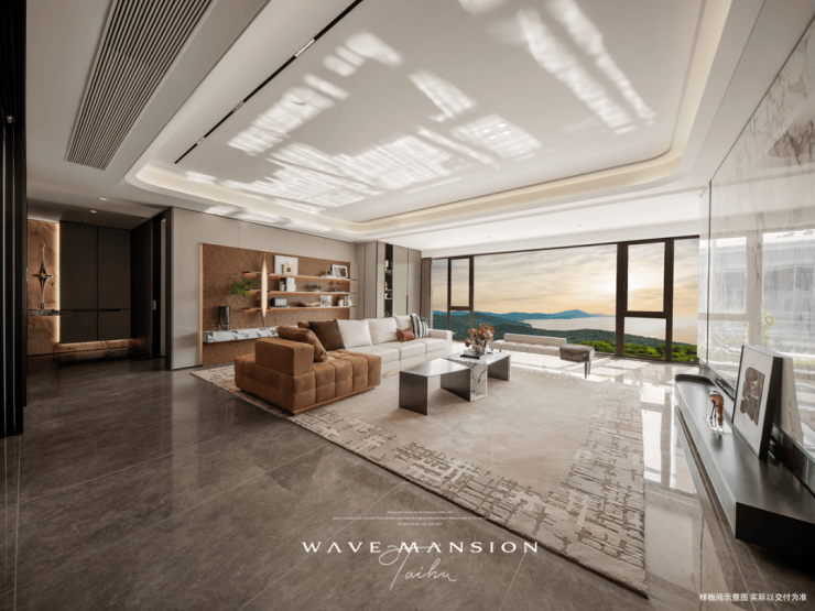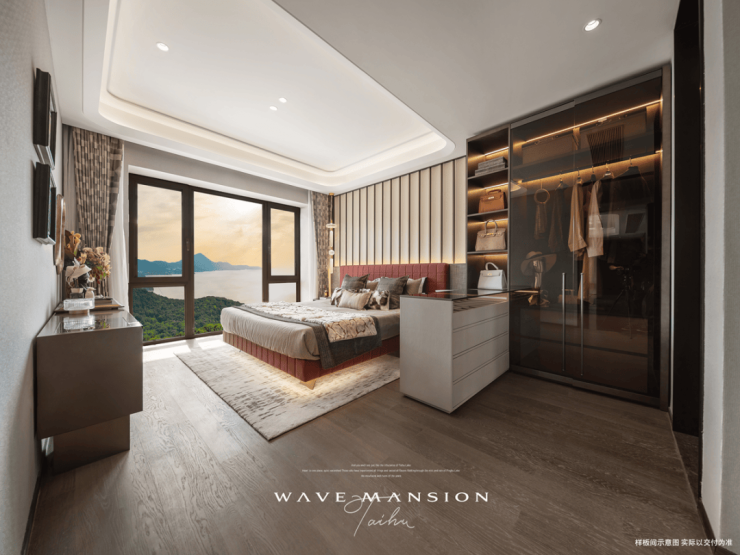 ③超大面宽。约16.6米、四开间朝南的超大面宽,配上约9.6米景观阳台以及L型采光设计,让家变为城市取景框,太湖、贡湖湾湿地公园等以4K级清晰度闯入生活。