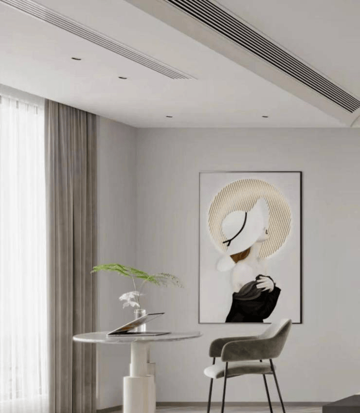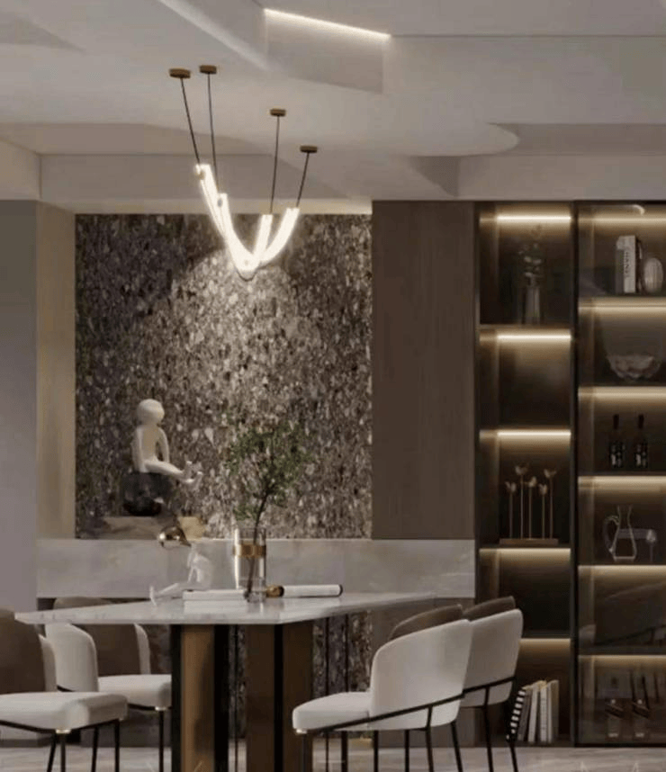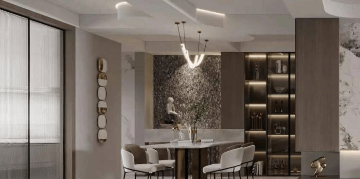 餐厅与客厅一脉贯通,以水吧台与餐桌将空间自然分割,使得舒适度与开阔感最大化,餐厨分而不离,无论家庭聚会亦或一家人的一日三餐,在这里交汇出别致的韵味。