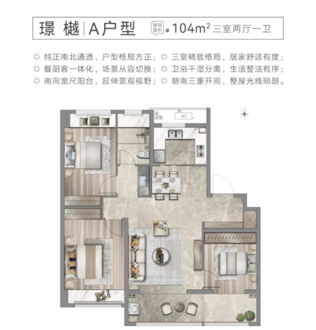 2号楼座建面约104m²产品为例:约3.9米餐客一体布局,配合南向卧室,外接约6.8米双联阳台,真正做到与自然坦诚相见。沐光晨起,闲暇弄花,枕星入眠...成就生活美好模样。