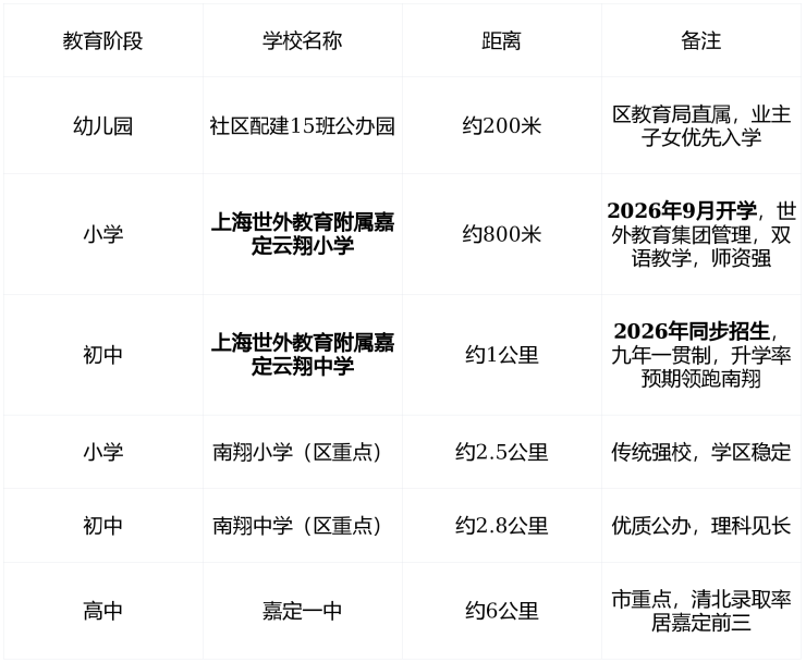 ✅ 关键提示 : 世外云翔小学/中学为2026年新开办 , 学区划片已明确 , 项目为首批对口小区 , 教育确定性极高 ,是 南翔唯一能“一步到位”入读世外系的楼盘 。