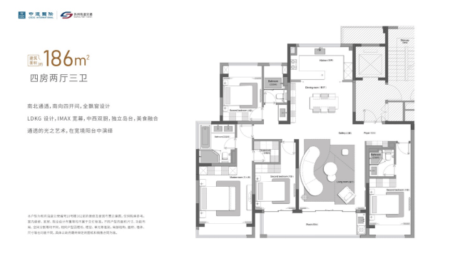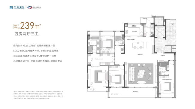 主力户型:建面约164㎡、189㎡、239㎡四房两厅三卫,均为大平层设计