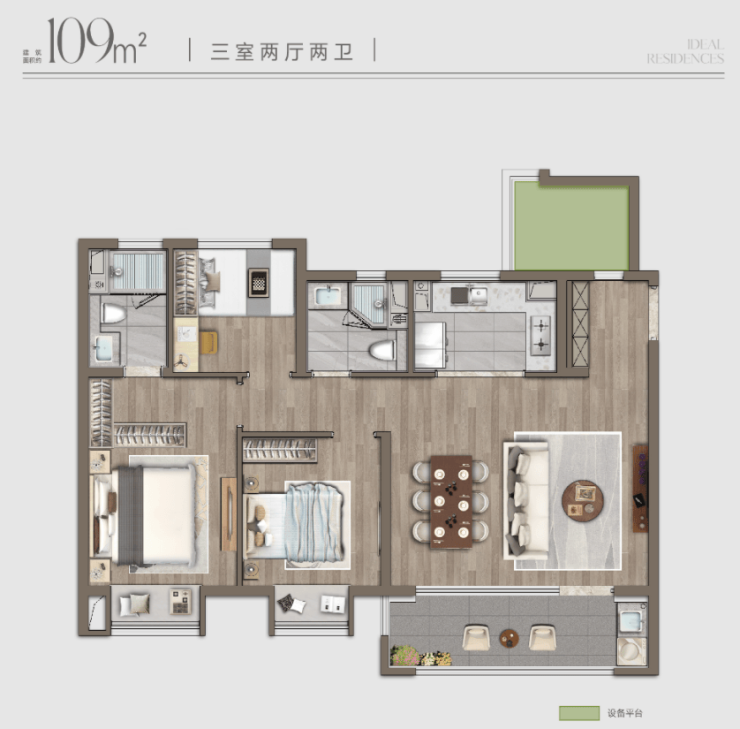 约109㎡通透阔境,南向三开间格局,约5.4m奢适横厅,外接宽景阳台,通透明媚;雍容主卧,配备独立卫浴,呵护主人隐私,奢华品位不彰自显;全优三房,生活面面俱到,从容随心。