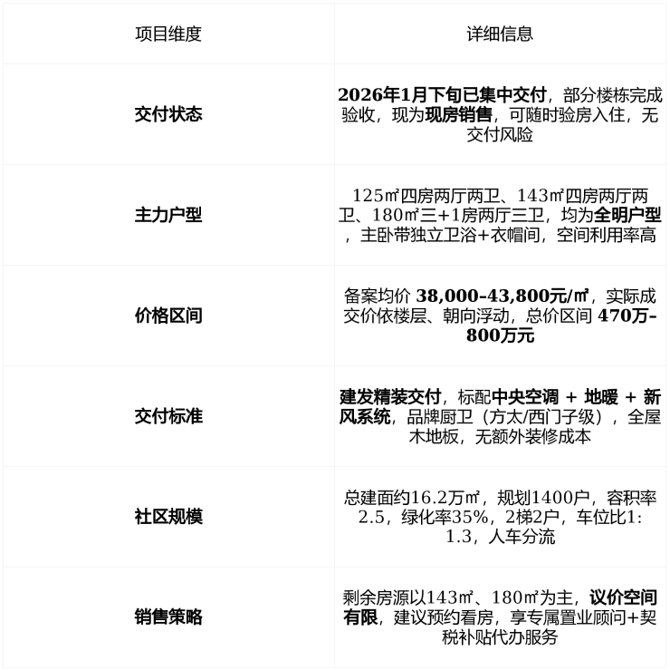 在售状态现房交付中 ,2026年1月下旬集中交房,剩余主力户型为 125㎡、143㎡、180㎡四房 ,备案均价 38,000–43,800元/㎡ ,总价 470万–800万元
