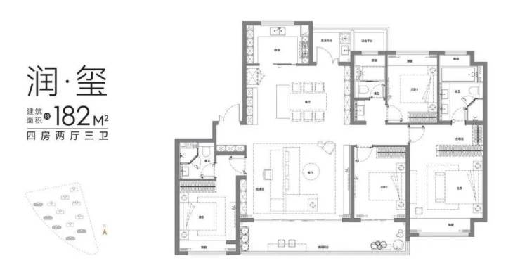 户型设计:主力143㎡(四房两卫)、182㎡(四房三卫),均为2梯2户,得房率74%-82%