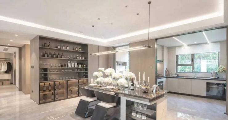 精装品质:配备日立中央空调、阿里斯顿地暖、百朗新风系统,厨房采用西门子五件套,卫浴为汉斯格雅+杜拉维特等一线品牌