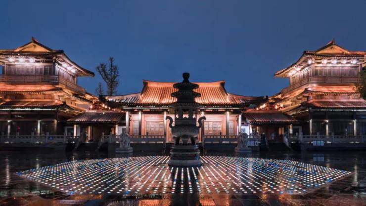 入园廊道天花板设计了星空顶,走道旁设有艺术装饰;往里走则是内庭水景区,让人仿佛踏进了喧闹城市中一方华丽又静谧的秘境,暖色灯光、林下休闲区,散发着慵懒的度假感。三进便是「艺术会所大堂」,请的是著名设计师吴滨。