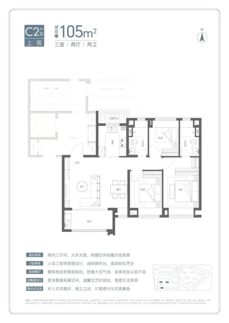 105㎡三房:提供宽厅(面宽5.5米)与竖厅双版本,搭配8㎡观景阳台,形成11.5米南向采光面,适合二胎家庭。