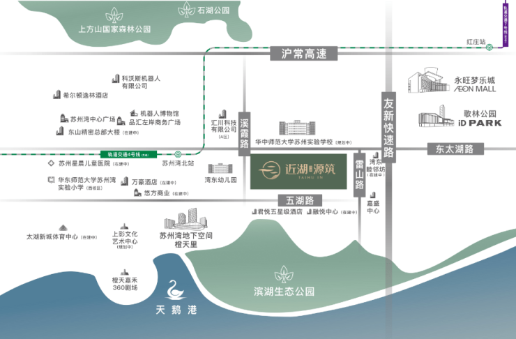 商圈|永旺梦乐城、iD PARK歌林、天鹅港“Z”型商业街(规划近湖源筑4008083612)、橙天里(待运营)、吴郡睦邻坊、希尔顿逸林酒店、君悦酒店、万豪酒店(在建近湖源筑4008083612)、悠方商业(在建)、品汇左岸商务广场、湾东睦邻坊(在建近湖源筑4008083612)。
