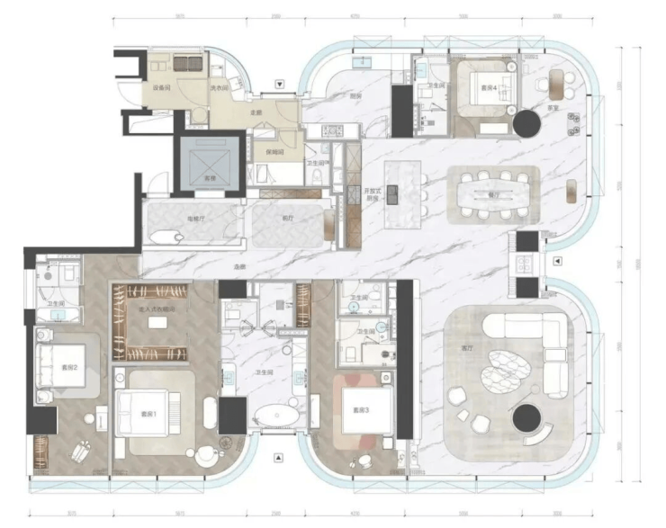 :顶层复式户型设6米挑高星空酒吧,赠送60㎡私属露台。