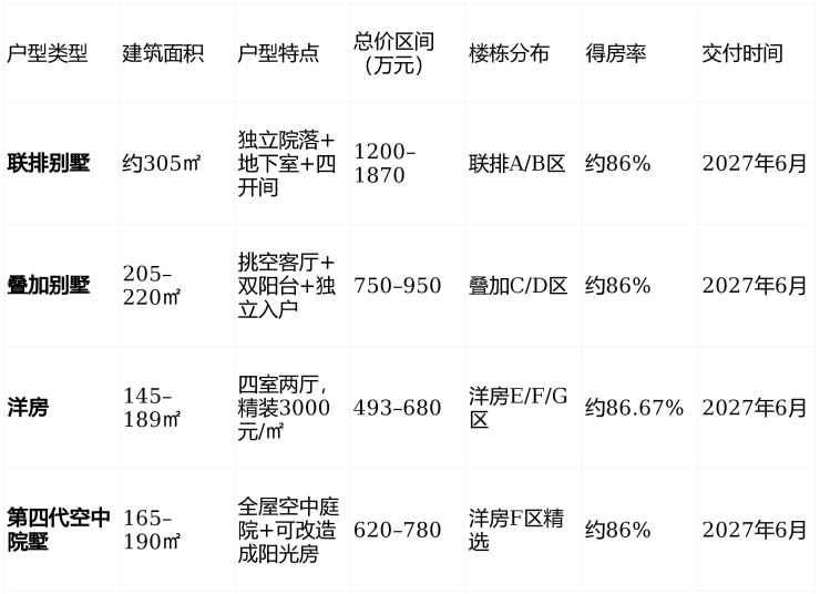 ✅ 温馨提示 :目前 联排别墅剩余不足10席 ,叠加别墅余量约15套,洋房主力户型(145–165㎡)仍有少量可选,建议优先锁定 东向或南向院落房源 。