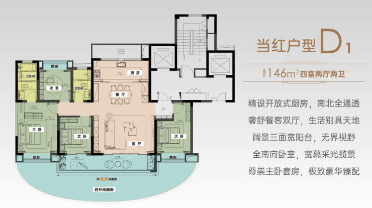 项目主力户型为93–146㎡的三居、四居,满足刚需及改善型家庭需求: