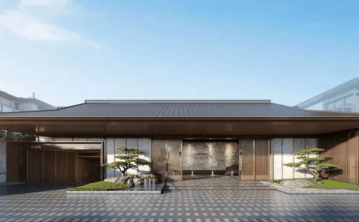 主入口采用王府形制设计,退让超十米空间,搭配太行山60吨自然老石皮背景墙、日本进口罗汉松等,仪式感拉满。