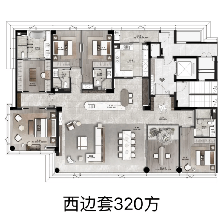 产品定位:类一梯一户设计,私梯入户,得房率高达85%–86%,实际使用面积媲美市面220㎡以上产品