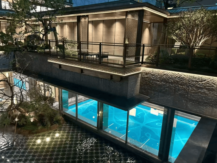 项目以“王府中式”为设计内核,打造约53米宽、10.89米高歇山顶门庭,配黄铜狮镇宅、蓝翡翠奢石景墙、百年罗汉松迎宾,入户即享尊崇仪式感。园林融合“柳浪闻莺”“花港观鱼”等西湖十景元素,辅以雾森系统与风雨连廊,四季皆景,移步换景。