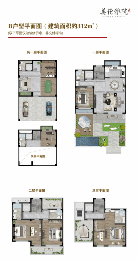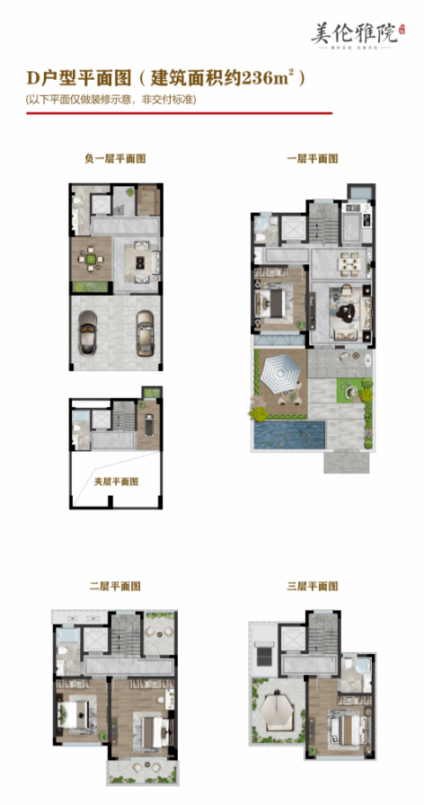 主力户型236-350㎡,地上3层+地下1层设计,地下层高5.8米,1楼层高3.6米,空间感突出