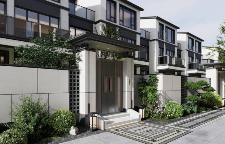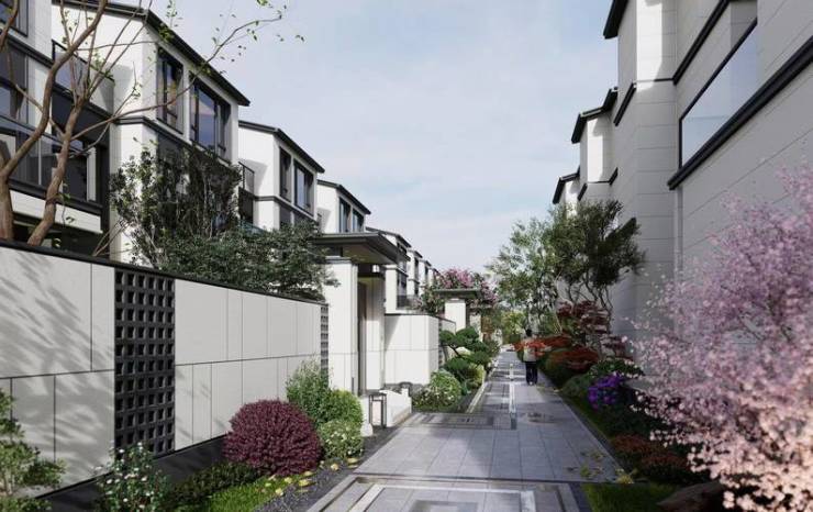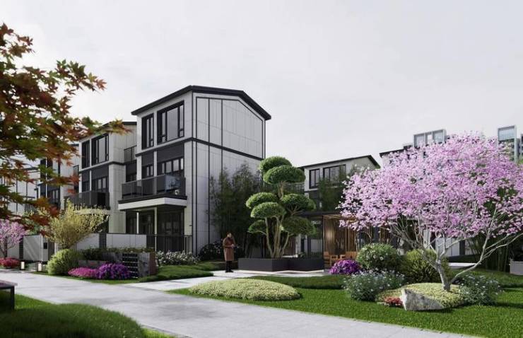 园林融合江南风格,周边有中央公园、滨水绿带等公共景观