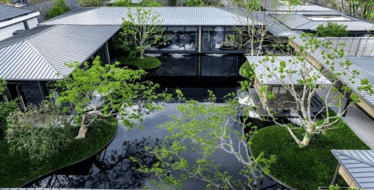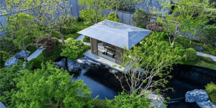 四時佳興:以诗意东方为境,前庭水景营造五座浮岛,彰显央企修为