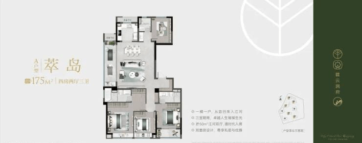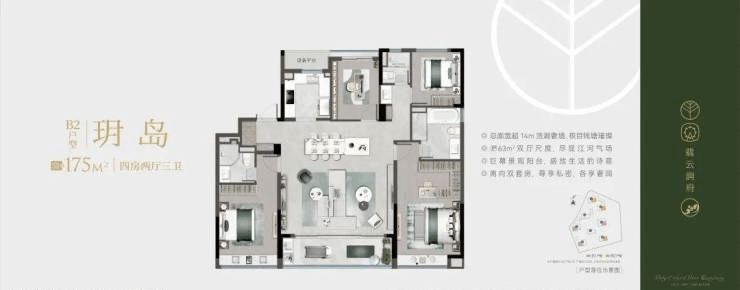 175㎡的“萃岛”、“玥岛”户型:户型南向尺度14米,拥有业内热门的LDKG设计,配搭面宽双阳台,餐客厅拥有了大宅特有的“迴游动线”;跑道式阳台拥270度观景视野,极目远望江河汇摩天轮,近观小区森林公园的鸟语花香。