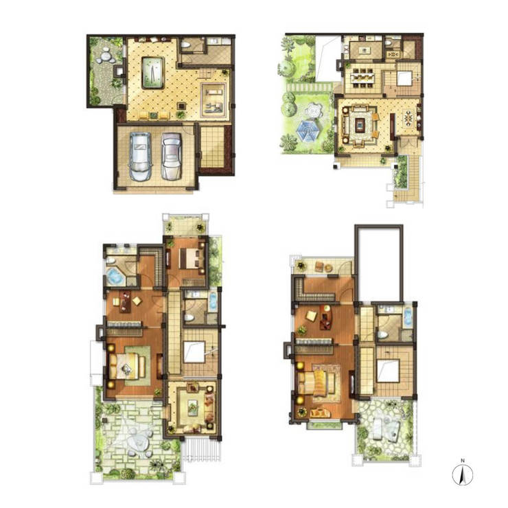 户型设计合理:有公寓和别墅等多种住宅类型,别墅户型有双拼、独栋等,面积跨度较大,从273-661㎡不等,部分户型赠送大露台和院子,得房率高,实际使用面积可观