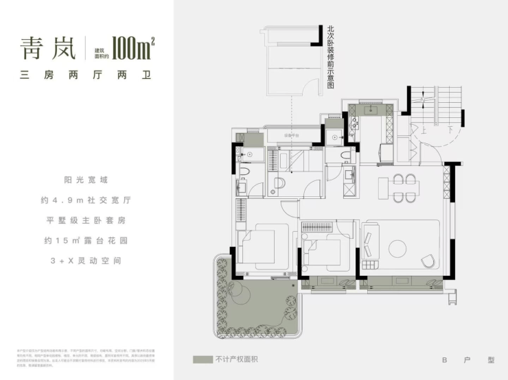 户户配备南北双花园+空中庭院:实际得房率超100%,100㎡户型可享近120㎡使用空间,推窗见绿、出门入园,真正实现“立体生活场域”。