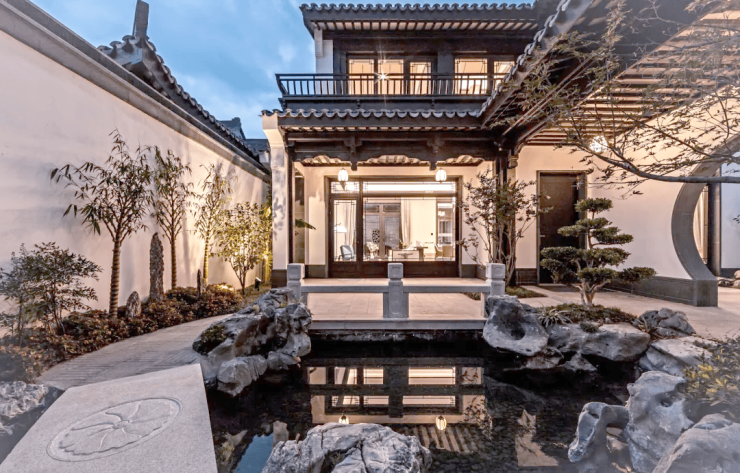 中式院居典范:传承“桃李系”3.0新作,采用白墙黛瓦、飞檐翘角、镂空花窗、月洞门廊等江南建筑元素,重现“庭院深深深几许”的东方意境。