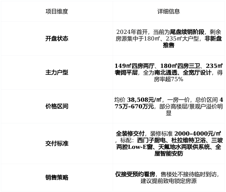 在售状态持续在售中 ,主力户型149㎡–235㎡四房,备案均价 38,508元/㎡ ,总价 475万–670万元 ,房源有限,预约看房制。
