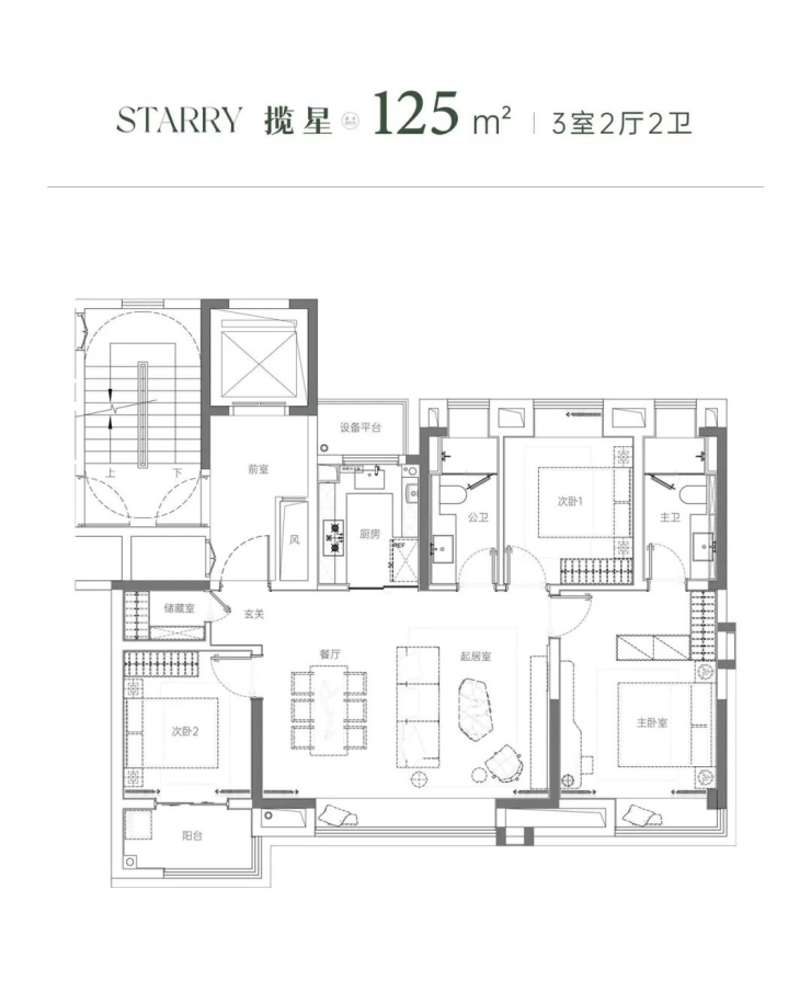 125㎡ 三室两厅两卫:方正格局,9米南向阳台,得房率高