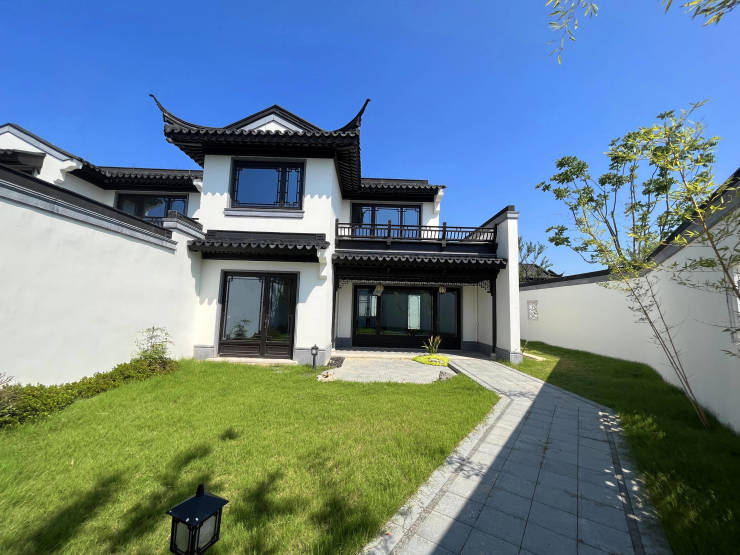 合院采用“白墙黛瓦+玻璃幕墙”现代中式风格,层高3.3米(一楼),地下室5.7米可自由分割