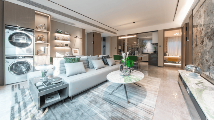 全系约5-6.2米宽厅设计,搭配全景落地窗,将阳光与风景最大尺度引入室内。博世地暖系统(卫生间无地暖)、格力新风系统、美的中央空调三大系统协同,实现“四季如春”的恒温体验。