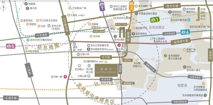 3号线+7号线+5号线(三大地铁中心点)旁边有金鸡湖大道、东环、娄江快速路、独墅湖大道、常台高速、南环,紧邻7号线群力站,短时间直达湖西CBD,通勤效率与城市资源占优;
