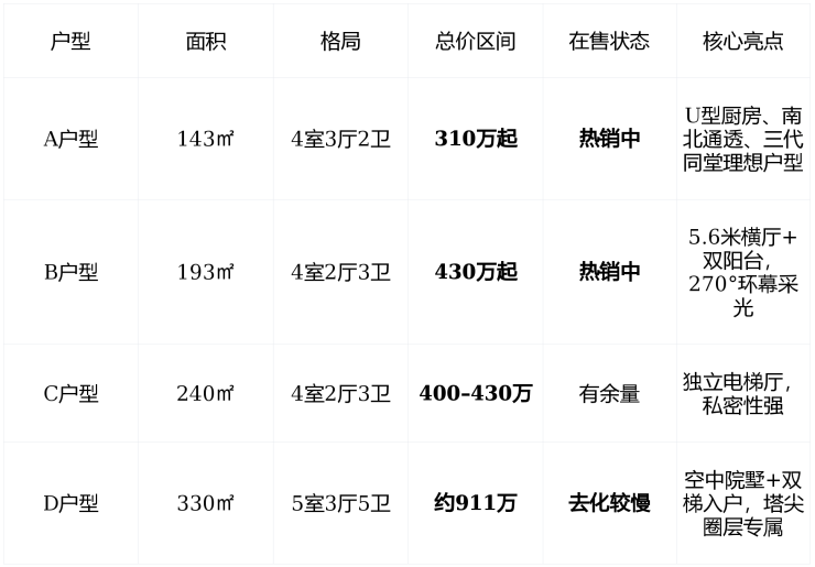 市场反馈 :143–193㎡户型供不应求,330㎡大户型因总价高,客户决策周期较长