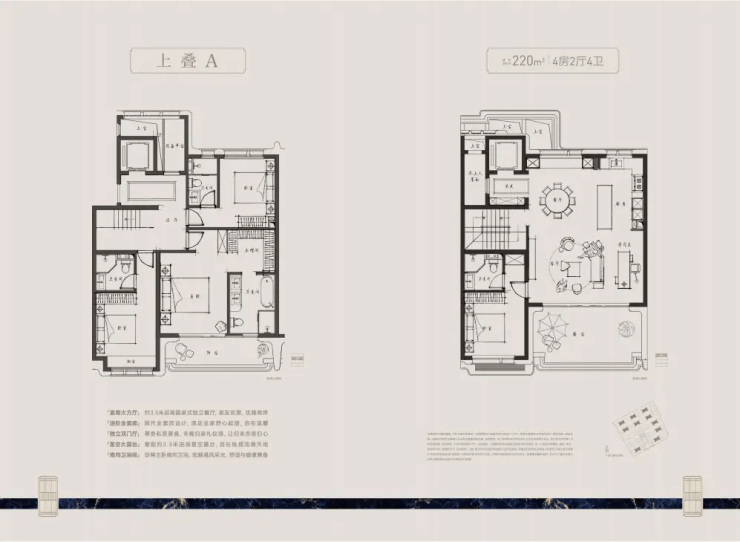 220㎡上叠:总价1160万起,配北向露台+顶层星空露台,观湖视野极佳;