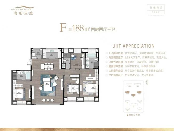 产品设计上,项目主打142-188㎡宽境大平层,全部为1梯1户配置,私享独立入户玄关,保障居家隐私;户型均为全明格局、方正通透,强调宽敞客厅、独立餐厅与多阳台布局,部分户型实现多间卧室朝南,最大化采光与通风效果^。188㎡户型更是做到了4室2厅3卫的奢阔配置,双套房设计满足三代同堂或二孩家庭的居住需求,主卧配备独立衣帽间与卫浴,细节处尽显品质。