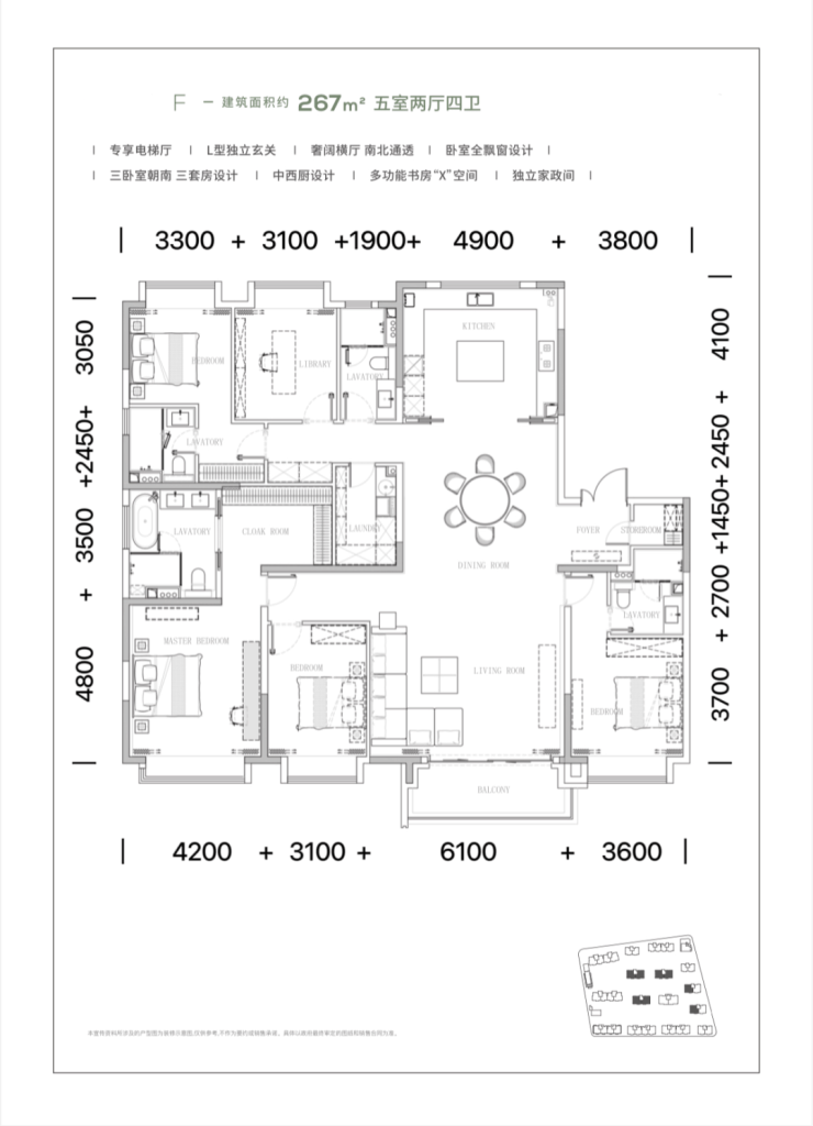 建面约269–330㎡五房两厅+书房(“终极改善型”,“5+1”灵活空间,可改六房)