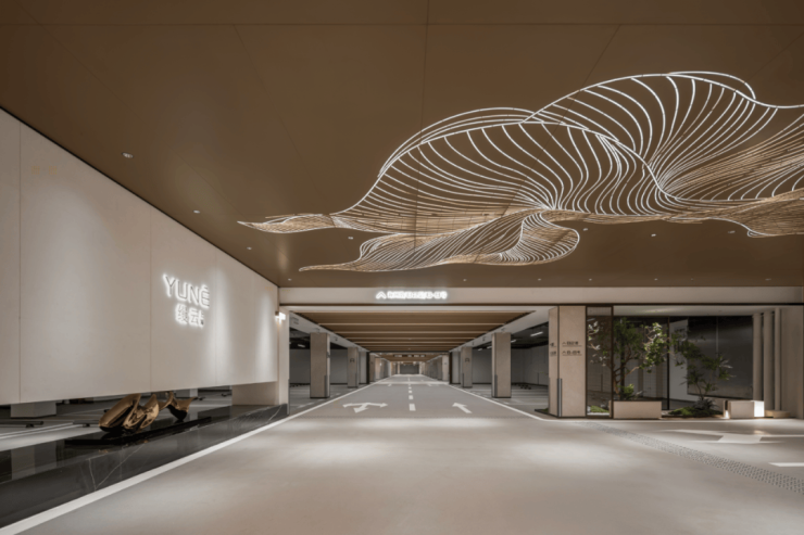现代极简风格,外立面采用航空级钛锌板+超白双银Low-E玻璃幕墙,顶部“云帆”造型为滨江新地标