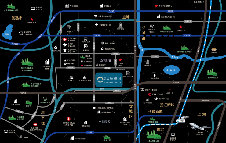 地理位置 :位于 双凤镇中心 ,地处“沪太同城”发展轴,紧邻 204国道、沈海高速、苏州绕城高速 ,自驾通达上海、昆山、苏州方向便捷