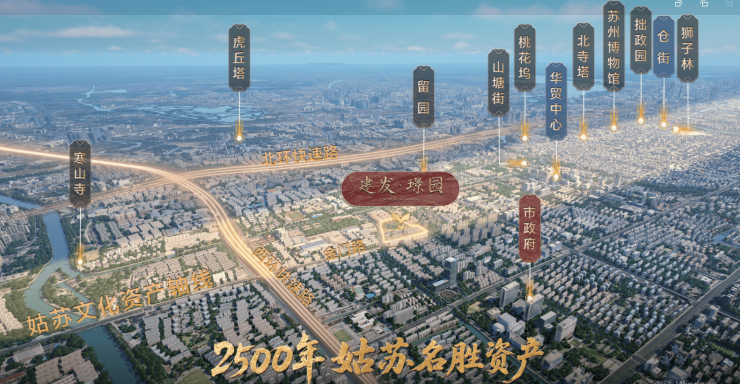 建发璟园位于 国家历史文化名城保护区核心 ,距 苏州市政府仅约600米 ,周边环绕 留园、山塘街 等世界文化遗产,是真正的“文脉之上”生活。