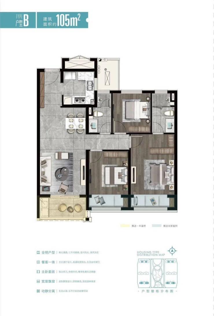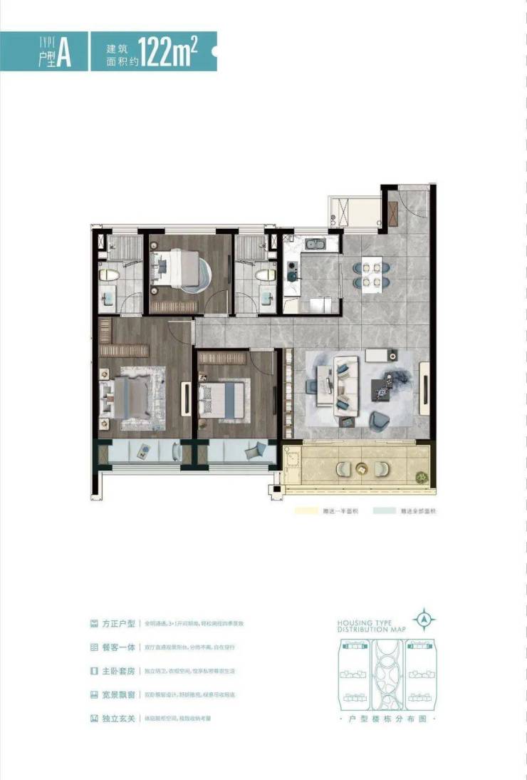 方正户型:全明通透,3+1开间朝南,轻松拥揽四季景致;