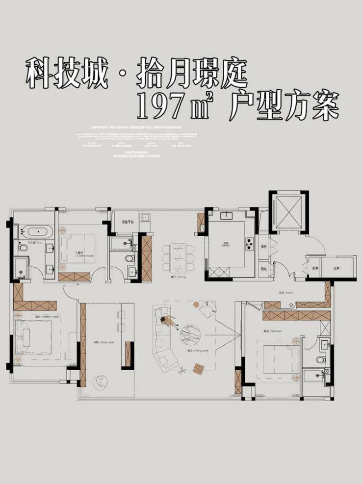 197㎡四居室:总价534-607万元,大横厅+双联阳台,功能间灵活
