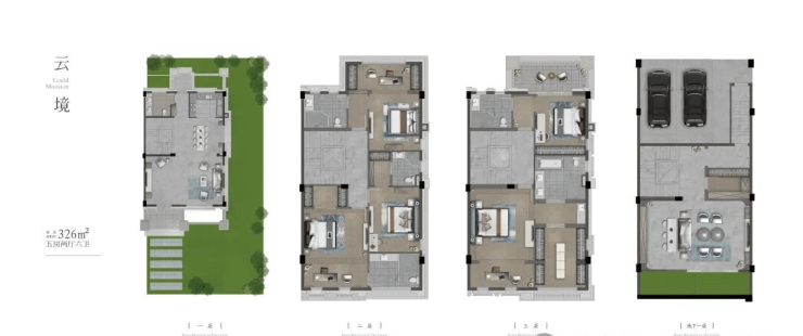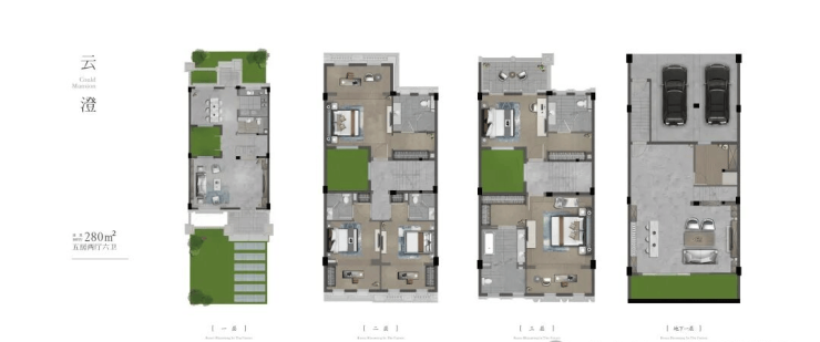主力户型:建面约280㎡、326㎡、355㎡法式联排别墅,五房起步,多数可改六房,地下一层+地上三层+阁楼拓展,实得面积超500㎡。